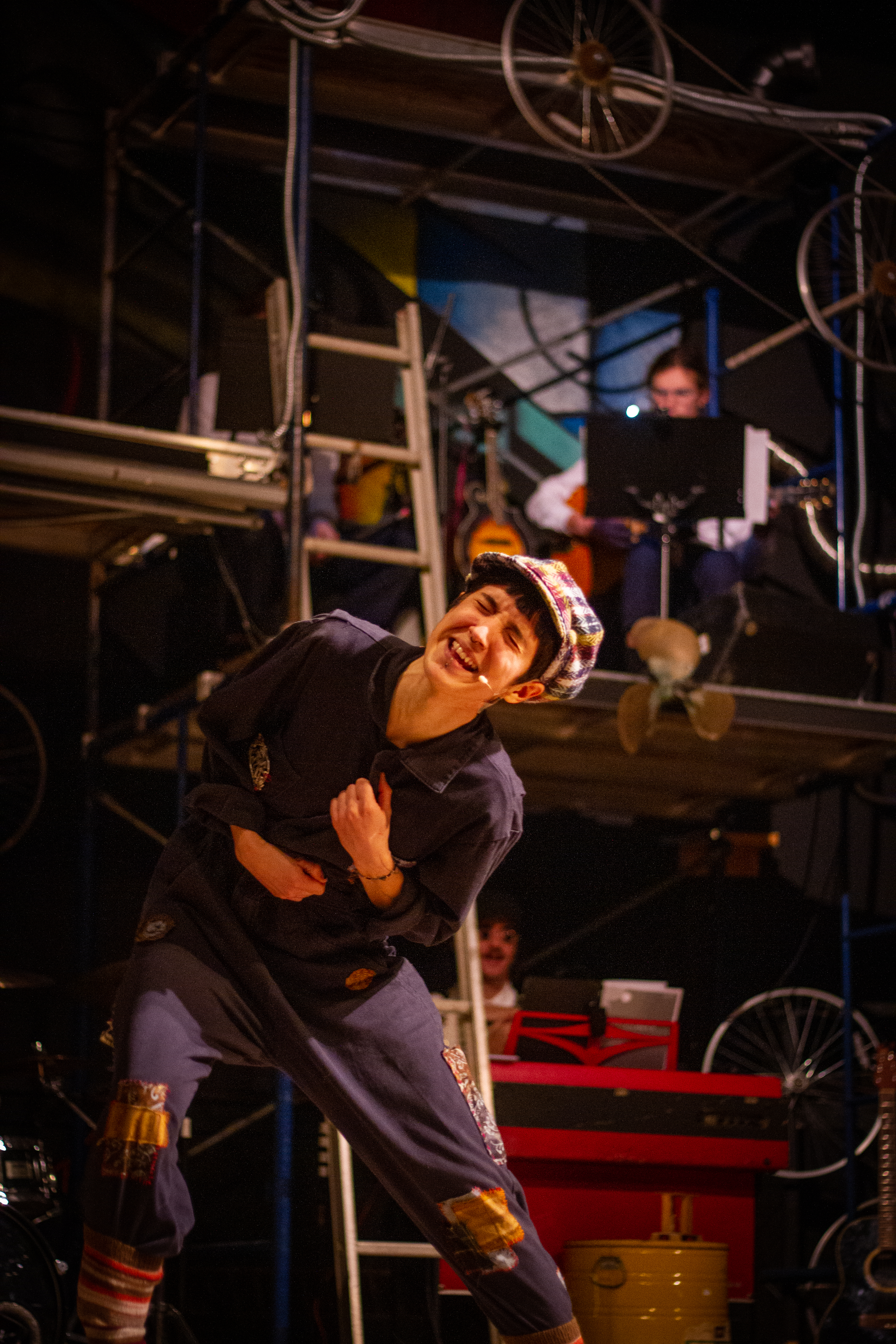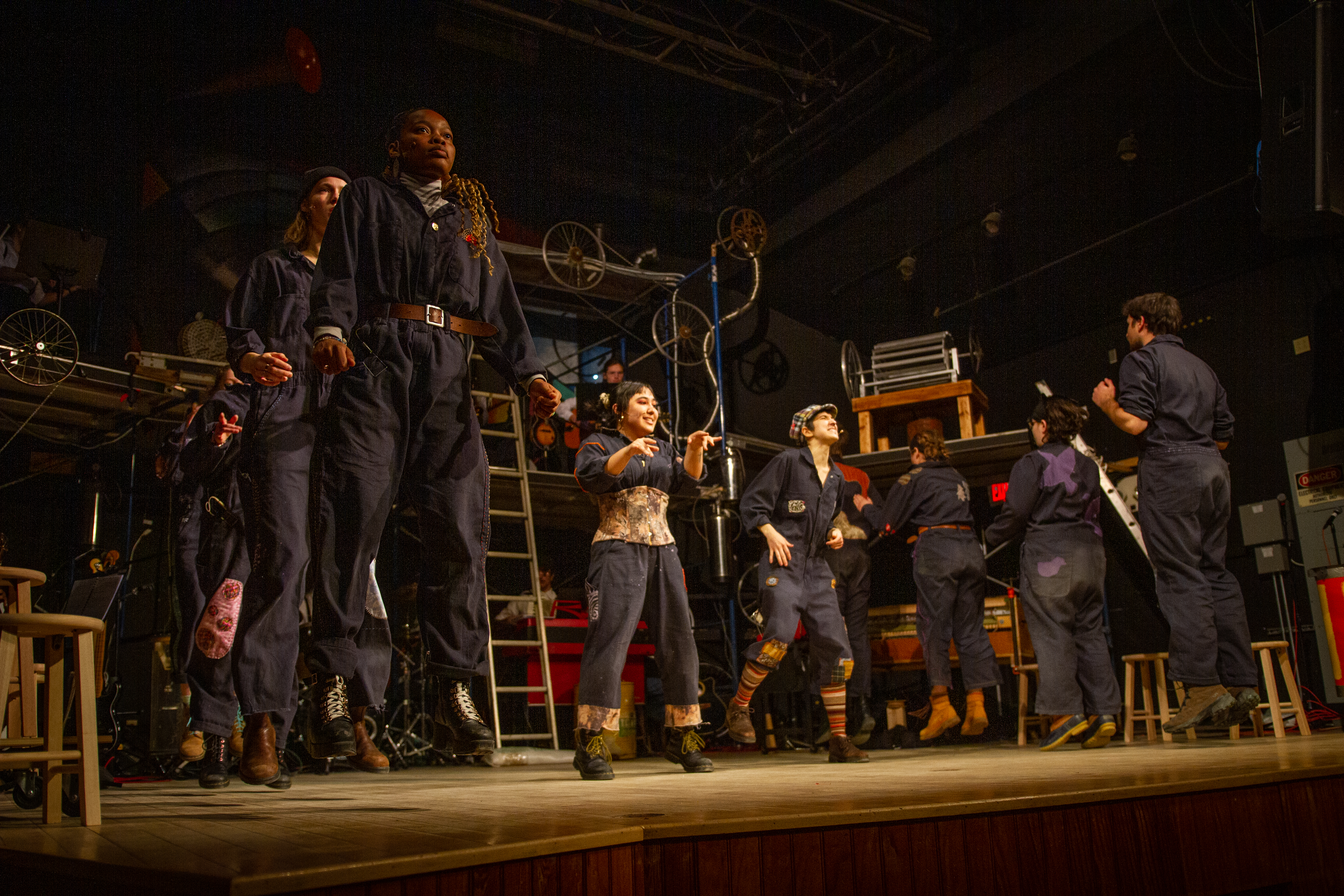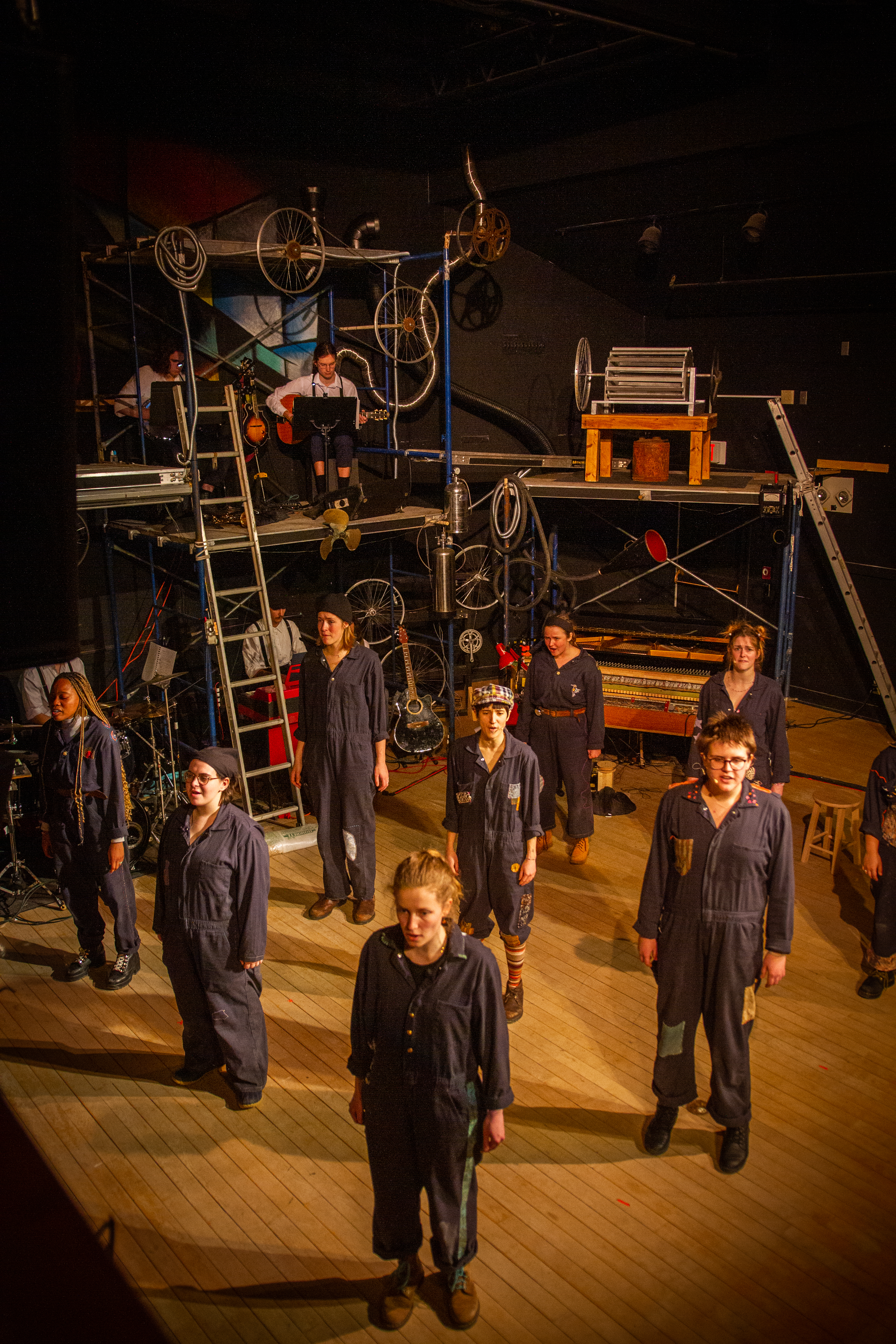 “Figures march around the stage, performing a scene from the musical they’ve spent eight weeks preparing for. Tall scaffolding scattered around the stage is adorned with pieces of bicycles, horns, ladders, boxes, chains, and empty silver cylindrical tanks that look like the ones deep sea divers wear. The actors pause, ushering silence into the room; a solitary bell rings through the dimly lit auditorium, a mallet on the wall strikes a xylophone that is suspended from the balcony, and a bass drum begins to thunder rhythmically in the corner. The air is filled with a cacophony of noise, emanating from machines of all shapes and sizes. The organist plays a chord, and in the blink of an eye the room rockets to life.