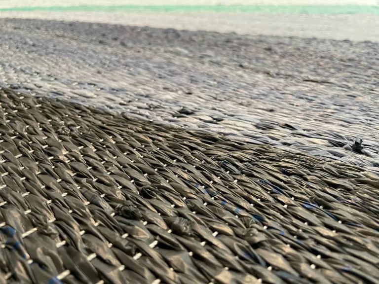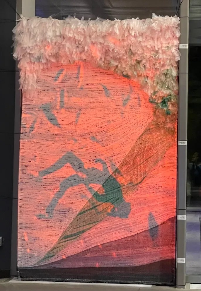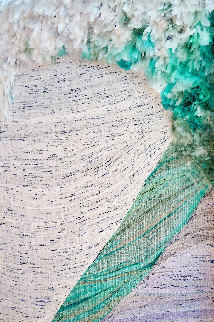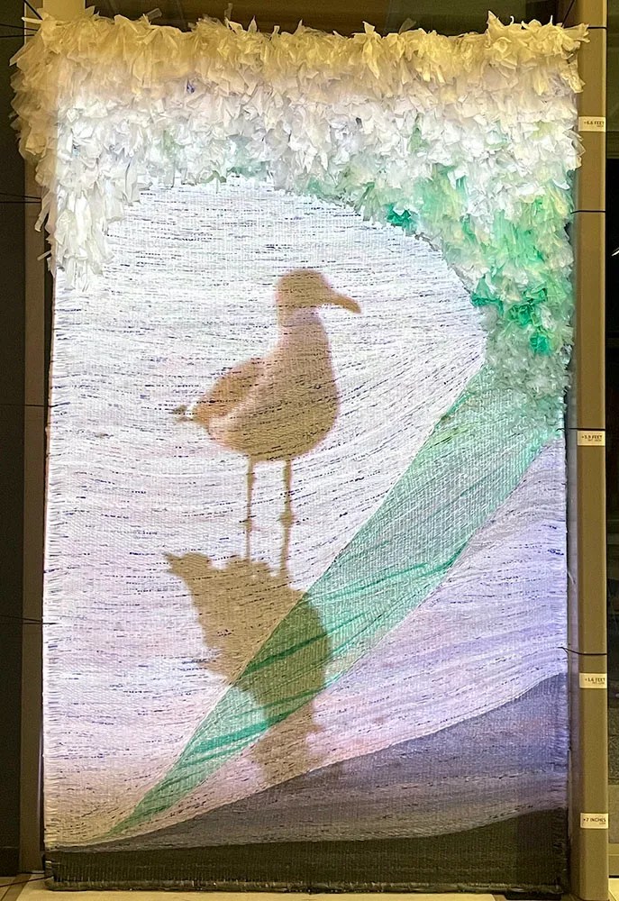 Climate change is not the only force altering our oceans. Plastic pollution is entering our waterways at an alarming rate, harming human health, entangling wildlife, and damaging marine habitats. Pollution in our waterways is an issue that is interwoven with all forms of life. To reclaim, and perhaps re-engage, this single-use material, the tapestry is woven from plastic bags. Over 300 bags were collected from the Durham community and processed into “plarn” or plastic yarn.