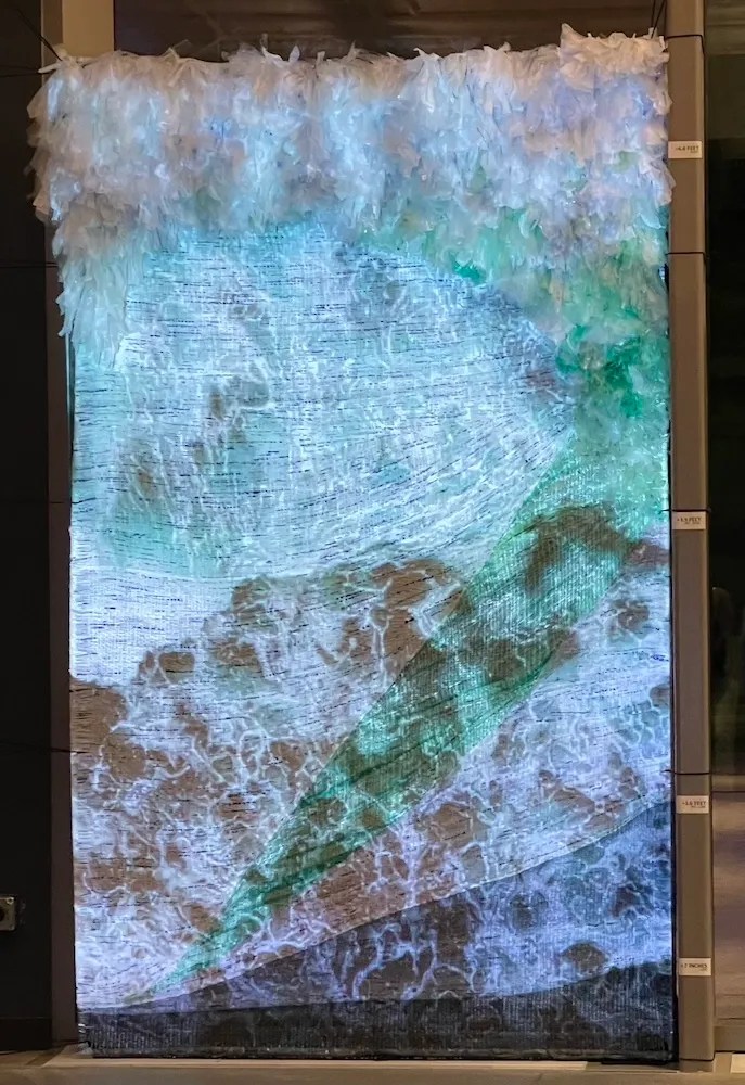 On the North Carolina coast, sea levels are already up to 11 inches higher than they were in 1950. Spectral Seas, a collaborative installation created by the Arts and Anthropocene Bass Connections team depicts the scale of future sea level rise, with each color in the tapestry representing a different NOAA sea level rise prediction for 2100. The gray section represents the lowest prediction, 7 inches of additional sea level rise, which would require an immediate reduction in global greenhouse gas emissions. The light green section represents over 6 feet of sea level rise, the highest prediction. At this level, the Duke University Marine Lab would be almost completely underwater.